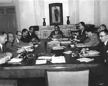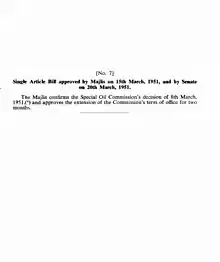 | Razmara demande la mise en place d'une Commission mixte composée de trois Sénateurs et de trois députés du Parlement, qu'il chargerait d'analyser et d'évaluer l'accord Gass-Golshayan. Le Sénat rejette la demande par majorité, car il n'est pas compétent. | |