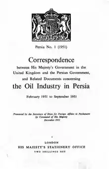 | 19 mai 1951 | L'ambassadeur britannique à Téhéran remet au gouvernement iranien un mémorandum dans lequel la position juridique britannique est réglée : Le gouvernement britannique conserve le droit à la Cour permanente d'arbitrage à La Haye pour faire appel. Le lendemain, le ministre iranien des Finances Varasteh informe la direction de l'AIOC, qu'il refuse ce droit. Les dirigeants de l'AIOC devront régler cette question avec la Commission pétrolière Parlementaire. |