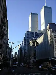 Les vols AA 11 et UA 175 frappent les Twin Towers, tours principales du complexe d'immeubles d'affaires du World Trade Center situé sur l'ile de Manhattan à New York dans l'État de New York, à 8 h 46 et à 9 h 3, provoquant leur effondrement, ainsi que la destruction d'un troisième bâtiment du complexe (la tour no 7) quelques heures plus tard. Les tours jumelles culminaient à 417 et 415 mètres, comprenaient chacune 110 étages et environ 50 000 personnes y travaillaient. Elles accueillaient de plus 40 000 visiteurs chaque jour. Le matin des attentats, 17 400 personnes se trouvaient dans les tours[1].