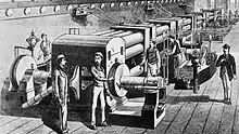 • 1880-1884 : le Premier ministre chinois Li Hongzhang lance un programme de construction d’une flotte de guerre moderne. En 1880, il établit une école navale à Tianjin, en 1882, il fait construire un port et un chantier naval à Port-Arthur, en 1884, envoie des étudiants en Europe pour apprendre la construction navale et la navigation[33]. En 1888, la flotte de Beiyang aligne plus de vingt navires de guerre[34].