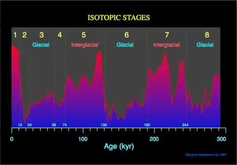 La courbe isotopique de l'oxygène a permis de définir une alternance de stades froids et tempérés, numérotés à partir du stade tempéré actuel ou stade 1, en remontant dans le temps. Ces stades sont appelés stades isotopiques de l'oxygène (SIO). Les stades froids portent des numéros pairs (2, 4, 6, etc.) et les stades tempérés portent des numéros impairs (3, 5, 7, etc.). Ils peuvent correspondre respectivement aux phases glaciaires et aux interglaciaires des anciennes chronologies locales, mais aussi à des épisodes intermédiaires, les interstades.
