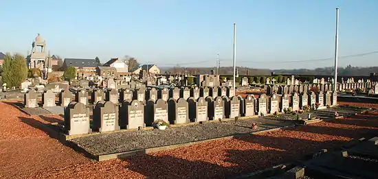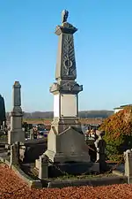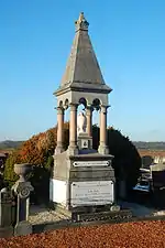 - le monument De Broux de Noirhat, large rectangle couvert de gravier, ceint d'une clôture de colonnes en pierre bleue et terminée par un petit mur orné de plaques en marbre blanc portant un grand crucifix ainsi que les noms d'une vingtaine de noms de membres de la famille De Broux de Noirhat ;