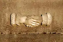 - les mains des époux unies à jamais dans la pierre, qui prolongent symboliquement leur union par-delà la mort ;