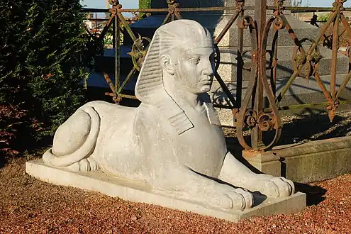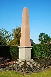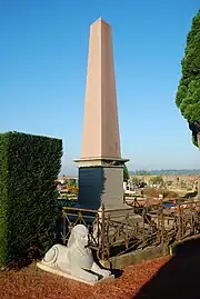 Par son style égyptien, cet obélisque en granit rose sur un socle de granit gris semble répondre au mausolée, dont un des sphinx est couché à ses pieds.