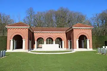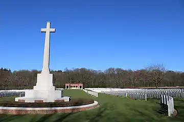 Les tombes des soldats de la Seconde Guerre mondiale sont disposées en arc de cercle autour de la croix du sacrifice.