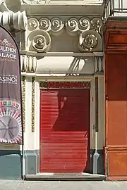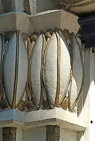 Ces pilastres sont prolongés par des modillons ornés de volutes blanches et or sortant du plan de la façade. Ces pilastres supportent également un large entablement orné d'une frise de fleurs dorées flanquée latéralement de volutes blanches à tranche dorée, semblables à celles de l'entrée de l'ancien cabaret-dancing.