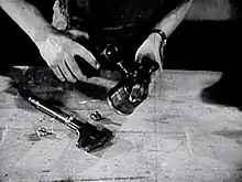 Image tirée du film "Petits travaux manuels - Soudure de tuyaux de plomb" de Lucien Deroisy. - Cinéma belge