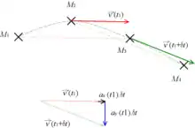 La deuxième approximation consiste à estimer la norme de la vitesse constante entre et ce qui est acceptable si la durée est petite par rapport à l'accélération tangentielle. On estime donc que l'on a :