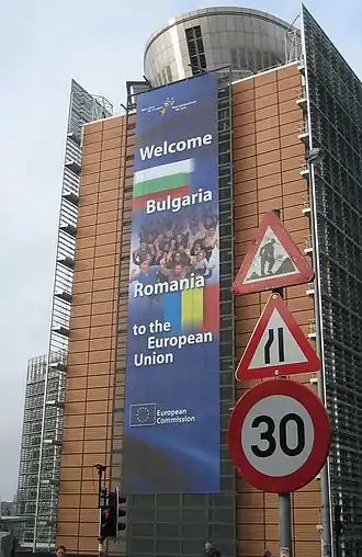 La Roumanie est le premier pays de l’Europe post-communiste à avoir des relations officielles avec la Communauté européenne. En 1974, un traité inclut la Roumanie dans le système généralisé des préférences commerciales de la Communauté. Depuis la révolution roumaine de 1989, l’adhésion est devenu l’objectif principal de chaque gouvernement roumain et de pratiquement tous les partis politiques. La Roumanie dépose sa demande officielle d’adhésion à l’UE en 1995 à la suite de la déclaration de Snagov[3]. Peu de temps après, la Hongrie et la Pologne la suivent. Deux chapitres ont empêché son adhésion en 2004, la situation économique et le sort des minorités Roms ; la Bulgarie a dû fermer ses réacteurs de la centrale nucléaire de Kozlodouy ; enfin les deux pays ont dû agir pour réduire drastiquement la corruption à tous les niveaux.
