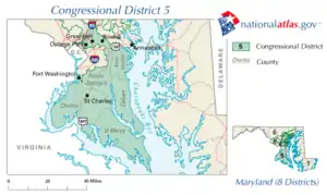 Le 5e district congressionnel du Maryland comprend la totalité des comtés de Charles, St. Mary's et Calvert, ainsi que des parties des comtés de Prince George et d'Anne Arundel. Le district est actuellement représenté par le Démocrate Steny Hoyer, qui de 2007 à 2011 et de 2019 à 2023 a été le chef de la majorité à la Chambre.