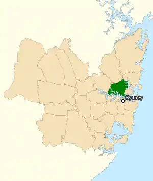 La circonscription de Sydney Nord (en vert) à Sydney en Nouvelle-Galles du Sud.