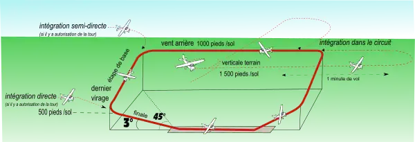 Tour de piste classique pour un avion léger type Cessna 172 (ce schéma peut changer selon l'aérodrome, s'informer auprès des services d'informations aéronautiques).