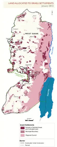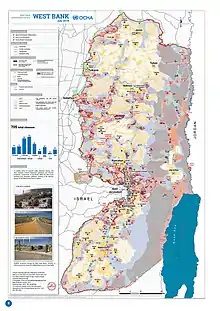 La Cisjordanie fait l'objet de onze résolutions de l'ONU dont la 242 du 22 novembre 1967[2], la 446 du 22 mars 1979[3], la 465 de 1980[3], la 1402 en 2002[4], la résolution du 30 décembre 2022[5]. À la suite des accords d'Oslo (1993) et de l'Accord intérimaire sur la Cisjordanie et la bande de Gaza (1995), Israël en administre seule la plus grande partie, la zone C (60 %), la zone B (22 %) étant administrée par Israël (qui contrôle cette zone pour la sécurité) et par l'Autorité palestinienne, la zone A (18 %) étant entièrement sous contrôle palestinien. L'Autorité palestinienne revendique toute l'étendue de l'ancien territoire géré par la Jordanie avant le 10 juin 1967, comme base de l'État de Palestine[6],[7]. L'Etat d' Israël y voit un territoire disputé, tandis que la communauté internationale la considère comme un territoire occupé.