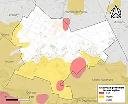 Les mouvements de terrains susceptibles de se produire sur la commune sont des tassements différentiels[17]. Le retrait-gonflement des sols argileux est susceptible d'engendrer des dommages importants aux bâtiments en cas d’alternance de périodes de sécheresse et de pluie[18]. 34,6 % de la superficie communale est en aléa moyen ou fort (79,5 % au niveau départemental et 48,5 % au niveau national)[Carte 2]. Depuis le , en application de la loi ÉLAN, différentes contraintes s'imposent aux vendeurs, maîtres d'ouvrages ou constructeurs de biens situés dans une zone classée en aléa moyen ou fort[Note 3],[19].