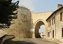 La porte de Laon est la plus spectaculaire des trois portes de la cité. Construite en même temps que le reste du château et de l'enceinte, elle se compose de deux tours d'un diamètre impressionnant juxtaposées, l'entrée se faisant par le petit espace (2,40 m.) situé entre elles et autrefois doté d'un pont levis. Les deux tours sont adossées, du côté intérieur, à un logis de grande dimension qui accueillait le conseil communal. La porte était encerclée par deux tours de guet supplémentaires, elles aussi d'un diamètre impressionnant, et était précédée d'une barbacane. aujourd'hui à demi enterrée. Durant la première guerre mondiale, les deux tours de la porte furent éventrées ainsi que le logis derrière elles. Les ruines de la porte demeurent cependant imposantes et en bon état. La reconstruction de la porte de Laon a commencé en 2010, le chantier avance chaque année.