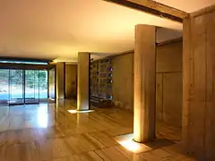 Le hall de la cité radieuse de Marseille est conçu comme une agora : c'est un espace de rencontre des habitants et des visiteurs[19]. Le Corbusier a élaboré ce lieu en réfléchissant aux effets de lumière qui pénètre par de grandes baies vitrées. La base de chaque pilier est également éclairée[19]. Le local d'accueil des gardiens est délimité par un bandeau de béton arrondi[19]. Tout un mobilier est prévu pour la vie quotidienne : une boîte aux lettres, des bancs, etc. Des coquilles incrustées dans le béton rappellent la nature qu'appréciait tant Le Corbusier[19].