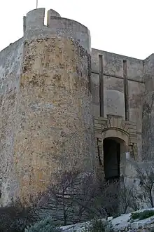 L'Office de Saint-Georges a construit progressivement une grande façade de fortification fermant l'accès à la péninsule de Bonifacio dans laquelle est placée le Bastardello, l' Orecchione et la nouvelle porte flanquée d'une tour dite de maestro Abrà. La porte est bastionnée vers 1550 sur le conseil de l'ingénieur Giovan Maria Olgiati[10]. Ce n'est qu'en 1460 que Jean II d'Aragon ne fait plus mention de la Corse parmi ses possessions.