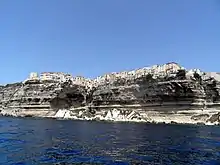 Bonifacio est bâtie sur un plateau calcaire à couches horizontales présentant une haute falaise côté mer d'environ 60 mètres de hauteur.