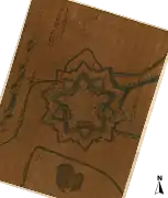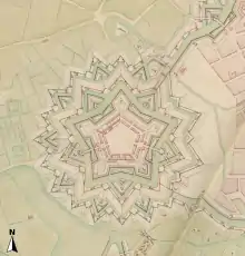 1 Rempart; 2 Tenaille; 3 Fossé principal; 4 Demi-lune; 5 Premier glacis; 6 Second glacis