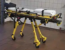 Le brancard d'ambulance peut se poser sur un chariot muni de roues qui facilitent le transport. Le chariot a une position basse, pour permettre le relevage d'une victime au sol, et une position haute, pour le brancardage et la mise dans l'ambulance. On peut enlever le brancard du chariot afin de procéder à un brancardage manuel ; le brancard lui-même est souvent muni de petites roues, ce qui facilite la poussée durant un pont simple ou amélioré.