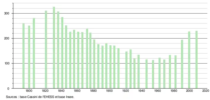 L'évolution du nombre d'habitants est connue à travers les recensements de la population effectués dans la commune depuis 1793. À partir du , les populations légales des communes sont publiées annuellement dans le cadre d'un recensement qui repose désormais sur une collecte d'information annuelle, concernant successivement tous les territoires communaux au cours d'une période de cinq ans. Pour les communes de moins de 10 000 habitants, une enquête de recensement portant sur toute la population est réalisée tous les cinq ans, les populations légales des années intermédiaires étant quant à elles estimées par interpolation ou extrapolation[3]. Pour la commune, le premier recensement exhaustif entrant dans le cadre du nouveau dispositif a été réalisé en 2008[4],[Note 1].