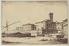 - Le fort Michelangelo fut commencé par Bramante sous le pape Jules II pour défendre le port de Rome, et complété en 1535 par Giuliano Leno et Antonio da Sangallo le Jeune, sous Paul III. La partie supérieure de la tour maschio, fut conçue par Michel-Ange, dont le nom est généralement donné à la forteresse. La structure, mesurant 100 m par 82 m (328,08 pi x 269,03 pi), comprend quatre tours d'un diamètre de 21 m (68,90 pi). Les côtés de la tour principale, de forme octogonale, mesurent 12 m (39,37 pi) de largeur. Les murs comportent une impressionnante épaisseur de 6 à 7,6 m (19,69 à 24,93 pi). La forteresse a été construite sur une ancienne construction romaine, probablement des casernes de la marine impériale (classiarii).