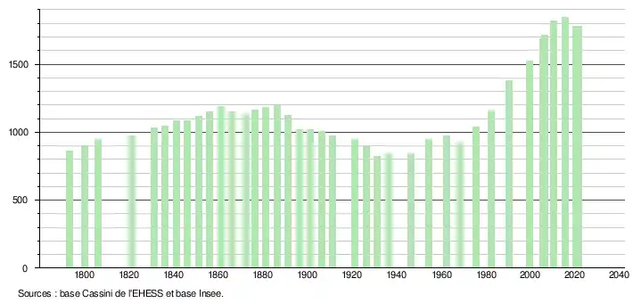 L'évolution du nombre d'habitants est connue à travers les recensements de la population effectués dans la commune depuis 1793. Pour les communes de moins de 10 000 habitants, une enquête de recensement portant sur toute la population est réalisée tous les cinq ans, les populations légales des années intermédiaires étant quant à elles estimées par interpolation ou extrapolation[35]. Pour la commune, le premier recensement exhaustif entrant dans le cadre du nouveau dispositif a été réalisé en 2005[36].