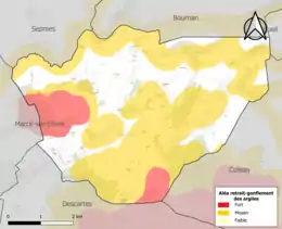 Le retrait-gonflement des sols argileux est susceptible d'engendrer des dommages importants aux bâtiments en cas d’alternance de périodes de sécheresse et de pluie. 66,8 % de la superficie communale est en aléa moyen ou fort (90,2 % au niveau départemental et 48,5 % au niveau national). Sur les 130 bâtiments dénombrés sur la commune en 2019, 66 sont en aléa moyen ou fort, soit 51 %, à comparer aux 91 % au niveau départemental et 54 % au niveau national. Une cartographie de l'exposition du territoire national au retrait gonflement des sols argileux est disponible sur le site du BRGM[22],[23].
