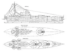 | Armement | 3 × 3 canons de 406 mm 12 canons de 152 mm en six tourelles doubles 6 canons de 120 mm en affut simple 8 canons de 40 mm en affut octuple 2 tubes lance-torpilles de 622 mm (1927) |