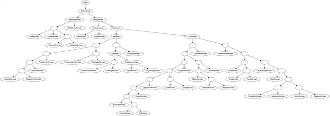 La définition de la plupart des anciens ordres a été modifiée ; les noms d'ordres (en -iformes) portés dans l'arbre sont ceux du Congrès ornithologique international. Le cladogramme présenté ci-dessus suit Hackett et alii 2008.