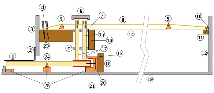 1) touche, 2) couteau, 3) barre de nom, 4) chevilles d'accord, 5) sillet, 6) chapiteau, 7) registres mobiles, 8) corde, 9) chevalet, 10) pointe d'accroche, 11) contre-éclisse, 12) éclisse courbe/pointe, 13) barre d'enfoncement, 14) table d'harmonie, 15) fosse, 16) contre-sommier, 17) sautereaux, 18) masse, 19) fond, 20) peigne, 21) pointe de guidage, 22) registres fixes, 23) sommier, 24) pointe de balancement, 25) cadre du clavier