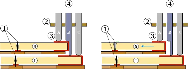 Le schéma ci-contre montre le fonctionnement d'une paire de registres : le registre inférieur est fixe ; le registre supérieur est mobile ; en se déplaçant longitudinalement (moins de 2 mm) il permet aux plectres de la rangée de sautereaux d'être dégagés des cordes ou de se placer au-dessous, afin de les pincer lorsque les touches correspondantes sont enfoncées.