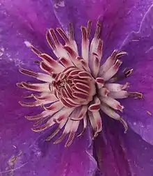 Le sépale de la clématite 'Ashva' mesure entre 6 et 7 cm, largement elliptique, se chevauchant. Le bord est légèrement ondulé[1].