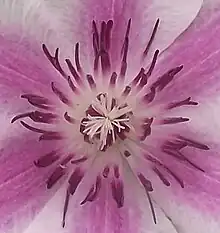 La clématite patens 'Carnaby' dispose d'une très grande fleur, rose sur l'extérieur des sépales et blanche au cœur. La fleur mesure entre 12 et 20 cm. les fleurs apparaissent au travers de bourgeons axillaires.