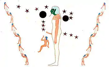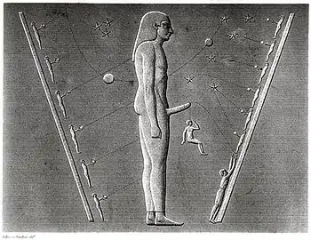 La rangée supérieure, en allant de la droite vers la gauche, représente les décans. La déesse Isis, associée à l'étoile Sothis se trouve au milieu tandis que vers la gauche sont représentées les quatre planètes Jupiter, Saturne, Mercure et Vénus :