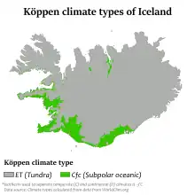 Le climat de l'Islande est un climat océanique froid (classification de Köppen : Cfc) près des côtes et de toundra (Dfc/ET) à l'intérieur dans les Hautes Terres d'Islande. L'île est située sur le chemin du Gulf Stream, qui rend le climat de l'île plus tempéré qu'on pourrait s'y attendre par sa latitude juste au sud du cercle arctique. Cet effet est amplifié par le courant d'Irminger, qui aide aussi à adoucir le climat. Le climat en Islande est réputé très variable. Les aurores polaires sont souvent visibles les nuits d'hiver.