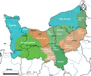 Le climat contrasté des collines, correspondant au Bocage normand, est bien arrosé, voire très arrosé sur les reliefs les plus exposés au flux d’ouest, et frais en raison de l’altitude. Cependant, il existe des contrastes notables entre les « zones basses » (fonds de vallées, dépressions… par ex. : Flers et les hauteurs très pluvieuses (ex. : Coulouvray). On retrouve globalement les mêmes types de caractères dans le Pays de Bray, en plus frais. Moins directement soumis aux flux océaniques, le Pays d’Auge, le Lieuvin et le Roumois connaissent toutefois des précipitations assez marquées en raison des reliefs collinaires qui favorisent leur formation. Plus au sud, le Pays d'Ouche et le Perche bénéficient d’un caractère continental plus affirmé : précipitations atténuées et amplitudes thermiques plus fortes[8].