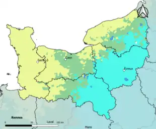 Le climat maritime, frais, humide et pluvieux, correspond au Cotentin et à l'ouest du département de la Manche. Les conditions deviennent plus agréables en allant vers le sud : moins venteux, plus doux et plus ensoleillé. La frange littorale se distingue par son caractère très éventé et tempéré : gel et chaleur rares, précipitations moins fréquentes et moins abondantes. Les contrastes pluviométrique et thermique sont parfois très prononcés en quelques kilomètres quand le relief est marqué (ex. : La Hague sur la côte et Gonneville sur les hauteurs). Il en est de même pour le Pays de Caux dans une ambiance globalement plus fraîche (ex. : Dieppe et Goderville)[8].