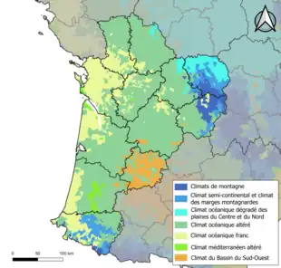 Une étude de 2010 réalisée par Daniel Joly, Thierry Brossard, Hervé Cardot, Jean Cavailhes, Mohamed Hilal et Pierre Wavresky a permis de classer les climats de métropole en huit grands types. Partant des mesures stationnelles de précipitation et de température mises à disposition par Météo-France, un jeu de 14 variables intégrant une série temporelle de 30 ans (1971-2000) est défini pour caractériser les climats et leurs modalités distinctives de variation. Une méthode originale dite d’interpolation locale permet de reconstituer les champs spatiaux continus des variables en question et de les exprimer sous forme de couches d’information gérables par SIG. Il en a résulté 8 types de climats[6]. La Nouvelle-Aquitaine ressort quant à elle de quatre zones zones : climat océanique franc, climat océanique altéré, climat du Bassin du Sud-Ouest les climats de montagne.