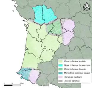La région Nouvelle-Aquitaine est historiquement partagée entre plusieurs climats[5] :