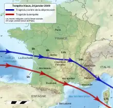 La tempête Klaus atteint les côtes aquitaines dans la nuit du 23 au 24 janvier et traverse les régions du Languedoc-Roussillon et du Midi-Pyrénées. Elle est accompagnée de rafales de vent de plus de 170 km/h. Les dégâts sont cependant importants (5 G€) et ont affecté le secteur forestier à hauteur de 3 milliards d’euros, les dommages assurés s'élèvent à 1,3 G€, 11 morts, 9 départements reconnus en catastrophe naturelle[42].