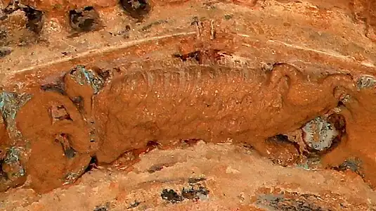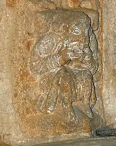- Les chevaux des rois mages : La place réduite a contraint le sculpteur à superposer les trois chevaux et à créer une impression de perspective par le biais de la position des têtes. La tête du dernier cheval déborde sur le bandeau végétal. Ces chevaux sont entiers, leur crinière est rassemblée en mèches et leur queue tombe jusqu'au sol. Leur harnachement est constitué d'une bride, d'une selle d'arme reposant sur une couverture. On peut supposer qu'ils sont attachés à l'arbre qui leur fait face.