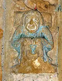 - Saint Guillaume et sa compagne, situés à gauche d'un diagonale qui coup le panneau, sont assez effacés ; le visage féminin a disparu complètement. Ils sont en position de spectateurs de la scène de la Passion ; cette position en fait les portraits des donateurs avec les symboles de leur saint patron. Notons que saint Guillaume est en symétrique avec saint Joseph du tympan, modèle de la paternité.