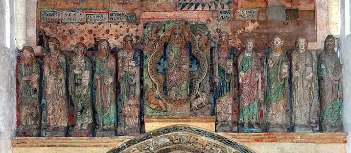 Ces statues ont probablement été démontées pour une restauration puis remontées dans le mauvais ordre, car les regards devraient converger vers le Christ, et tel n'est pas le cas. Deux statues monochromes ont été ajoutées plus bas et complètent le nombre des apôtres.