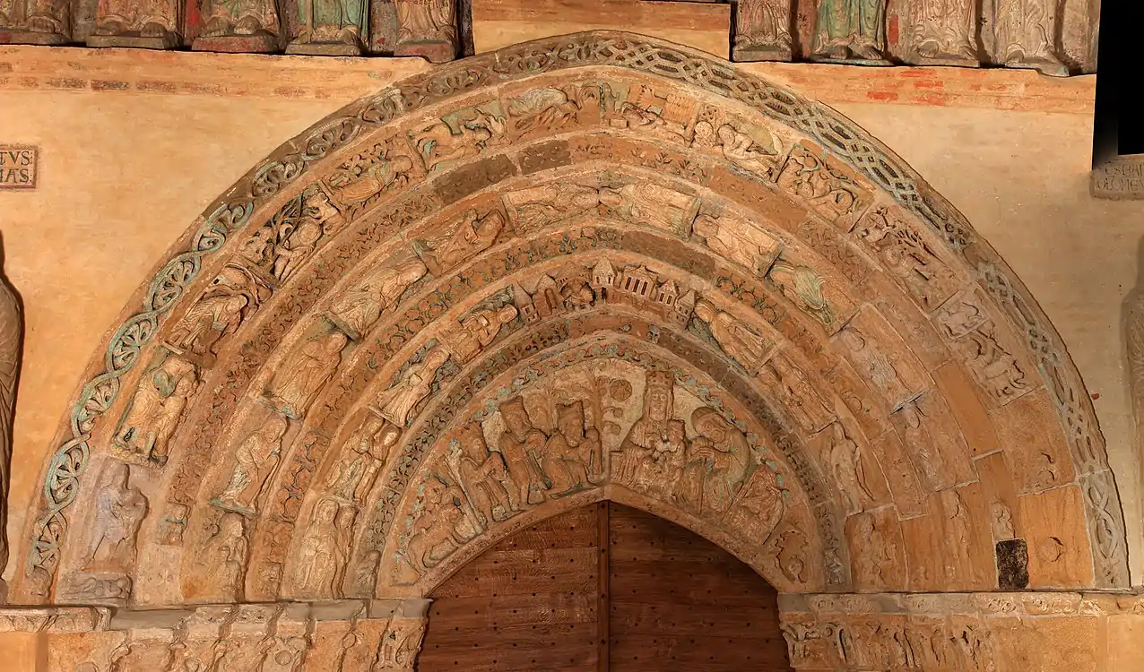 Le tympan, en forme de croissant, ne possède pas d’équivalent en France. Il fut probablement adoptée pour augmenter la hauteur du passage en son milieu. En contrepartie, cette forme introduit une contrainte pour le sculpteur puisque les deux extrémités du croissant sont réduites et fermées tandis que la zone centrale est large et ouverte.