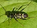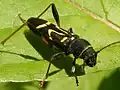 Sa livrée est vespiforme, aux pattes et antennes brunâtres. Ses antennes comptent au moins 11 articles, à l'apex foncé. Son pronotum est presque sphérique, au col orné d'une bande jaune, et la partie postérieure maculée d'un petit point jaune à chaque côté. Son scutellum est maculé d'une tache jaune et hémisphérique. Chaque élytre est également maculé de quatre taches jaunes, soit trois taches formant un carré ouvert dans la partie antérieure, et une longue tache arquée près de la pointe apicale.