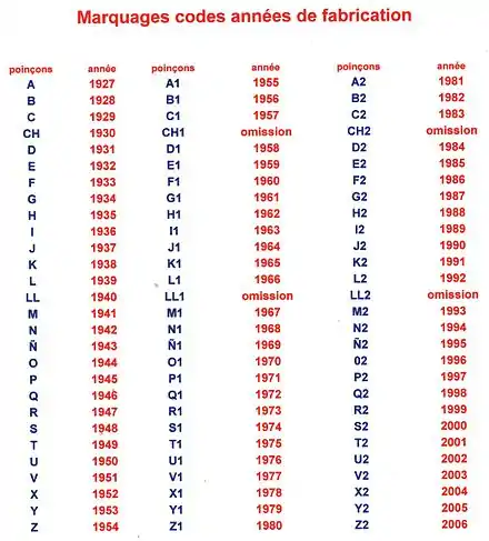 Tableau des correspondances lettres années de fabrication.