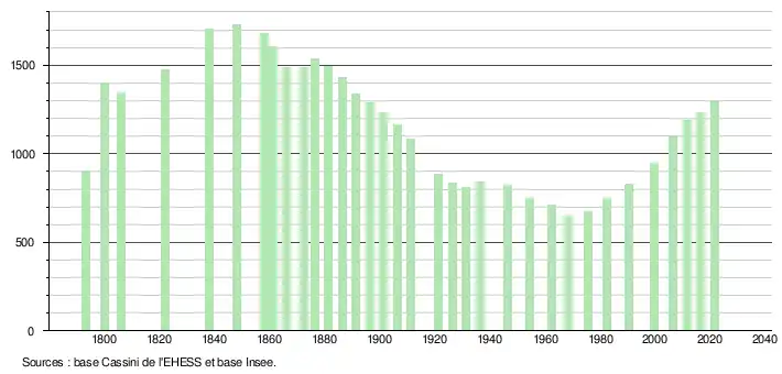 L'évolution du nombre d'habitants est connue à travers les recensements de la population effectués dans la commune depuis 1793. Pour les communes de moins de 10 000 habitants, une enquête de recensement portant sur toute la population est réalisée tous les cinq ans, les populations légales des années intermédiaires étant quant à elles estimées par interpolation ou extrapolation[22]. Pour la commune, le premier recensement exhaustif entrant dans le cadre du nouveau dispositif a été réalisé en 2006[23].