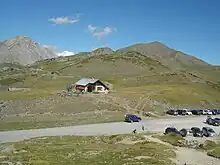 En arrière, les baraquements militaires dans les derniers hectomètres de l’ascension et la vue sur le massif des Écrins.