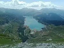 Vue depuis le rocher du Vent au nord-est du col de la Bâthie entre le Grand Mont à gauche et le mont Mirantin à droite par delà le lac de Roselend.